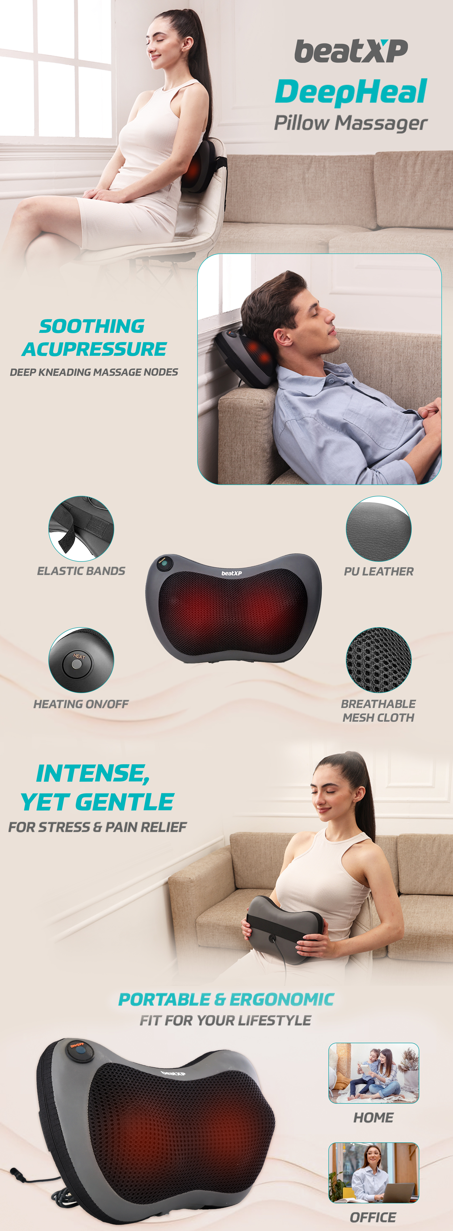 Package Contents: 1 x beatXP Massager Pillow, 1 x Home Power Adaptor, 1 x Car Power Adaptor and an Instructions Manual
