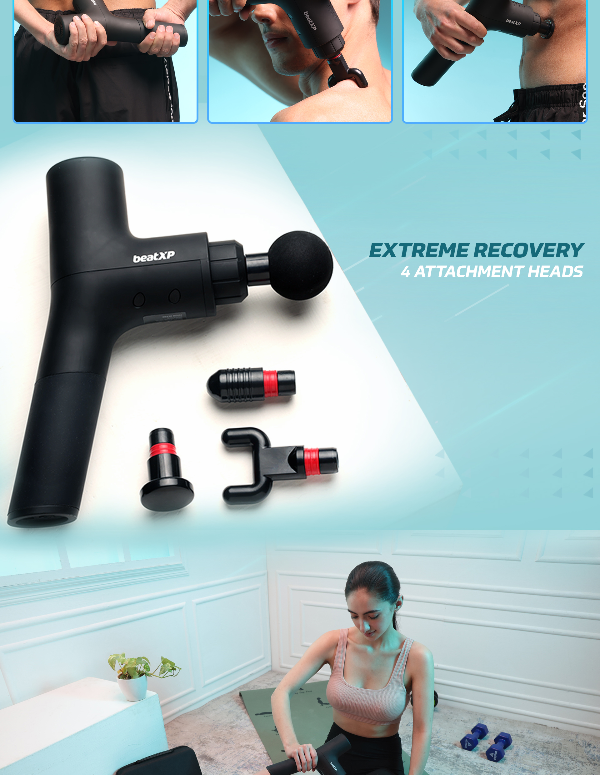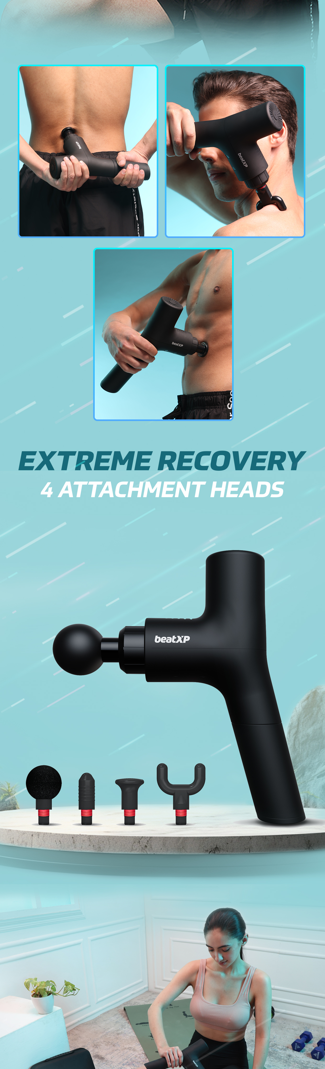 The rechargeable Lithium-ion battery with 4000 mAh capacity can easily power the device for about 3-5 Hrs on a single charge with the SwiftCharge Type-C Charging Cable. The massager has an almost noiseless operation with less than 45 dB noise even while being used at the maximum speed intensity of level 6. This is lesser than the sound made by birds chirping so that no one around you gets disturbed while using the device. The 4 interchangeable massage attachments ensure that no muscle group goes untargeted. The Round Head is for large muscle groups like Legs, Back, Biceps, and Chest while the Bullet head relieves joint pain and deep tissue soreness.
