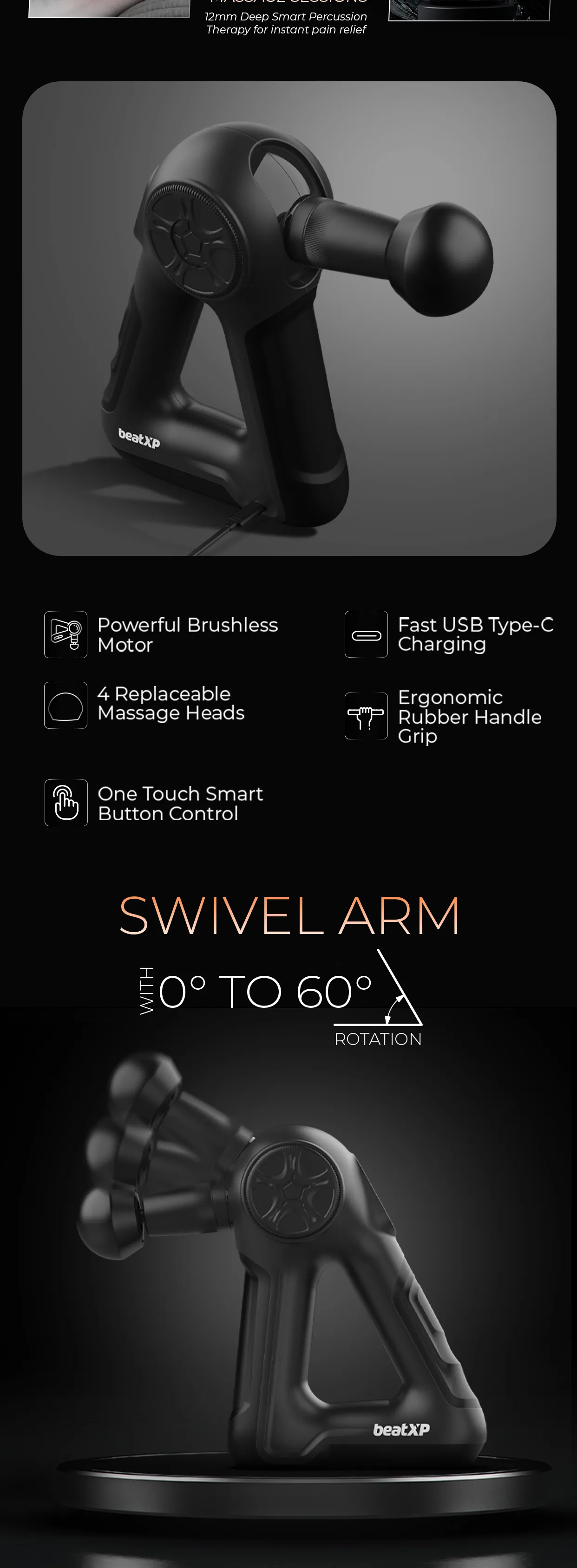 One of the standout features of this massage gun for full body is its swivel arm, which can adjust from 0° to 60° multi angle positions. This allows for an effective and comfortable massage experience that can be tailored to your specific needs. This full body massage machine has 4 replaceable head attachments which supports 12mm deep percussion therapy for a soothing massage experience. In addition, the hand massage machine is designed with a powerful lithium-ion battery that can last for longer hours. With SwiftCharge technology and a Type-C charging cable, you won't have to wait long to get back to your massage with our efficient and effective technology.