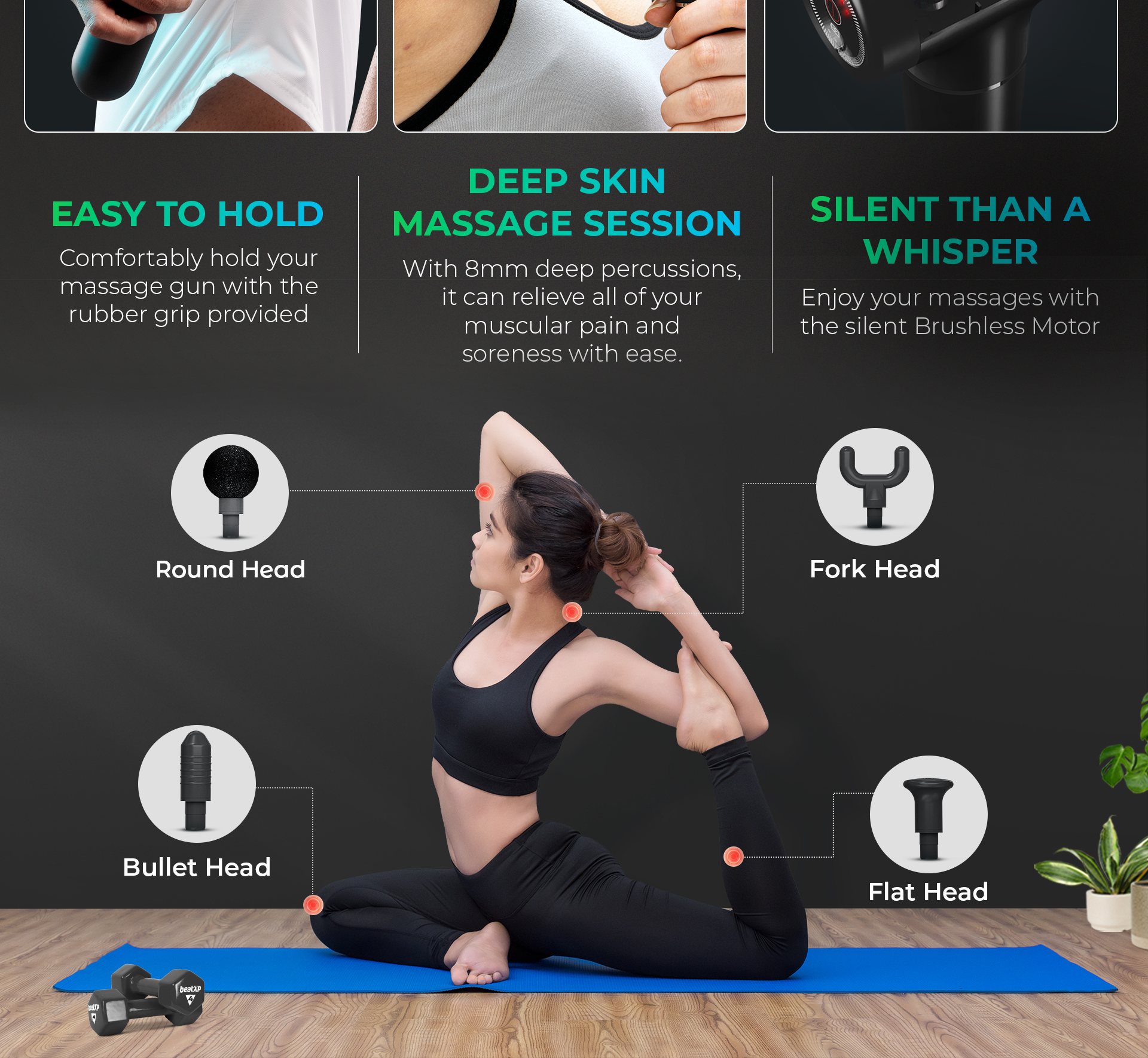 beatXP Flash Massage Gun is a powerful and compact deep tissue body massager to relieve stiffness, soreness, and pain in your body. This massager machine for pain relief helps in accelerating pain recovery by improving flexibility and range of motion. This massage gun is equipped with a powerful Brushless Motor with the new and improved QuietWave+ Technology and 6 adjustment speed levels ranging from 1800 - 3200 RPM. All that can be easily controlled with the one-button smart touch control provided at the back of this body massage machine.
