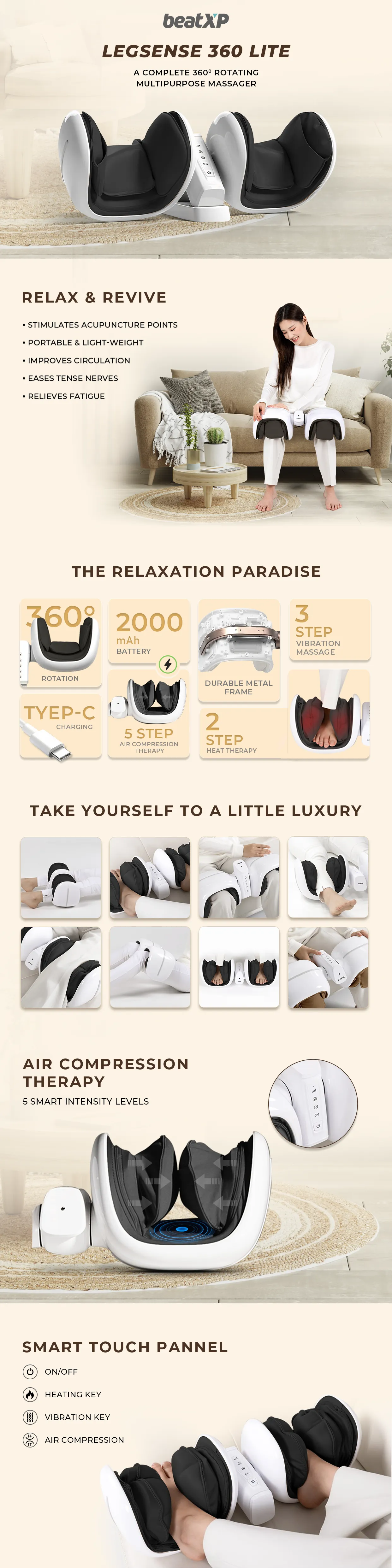 LegSense 360 Lite massager is the perfect massager for pain relief. Whether you experience soreness from standing for extended periods, post-workout fatigue, or general muscle tension, this device provides a complete massaging experience for your feet, calves, and legs.