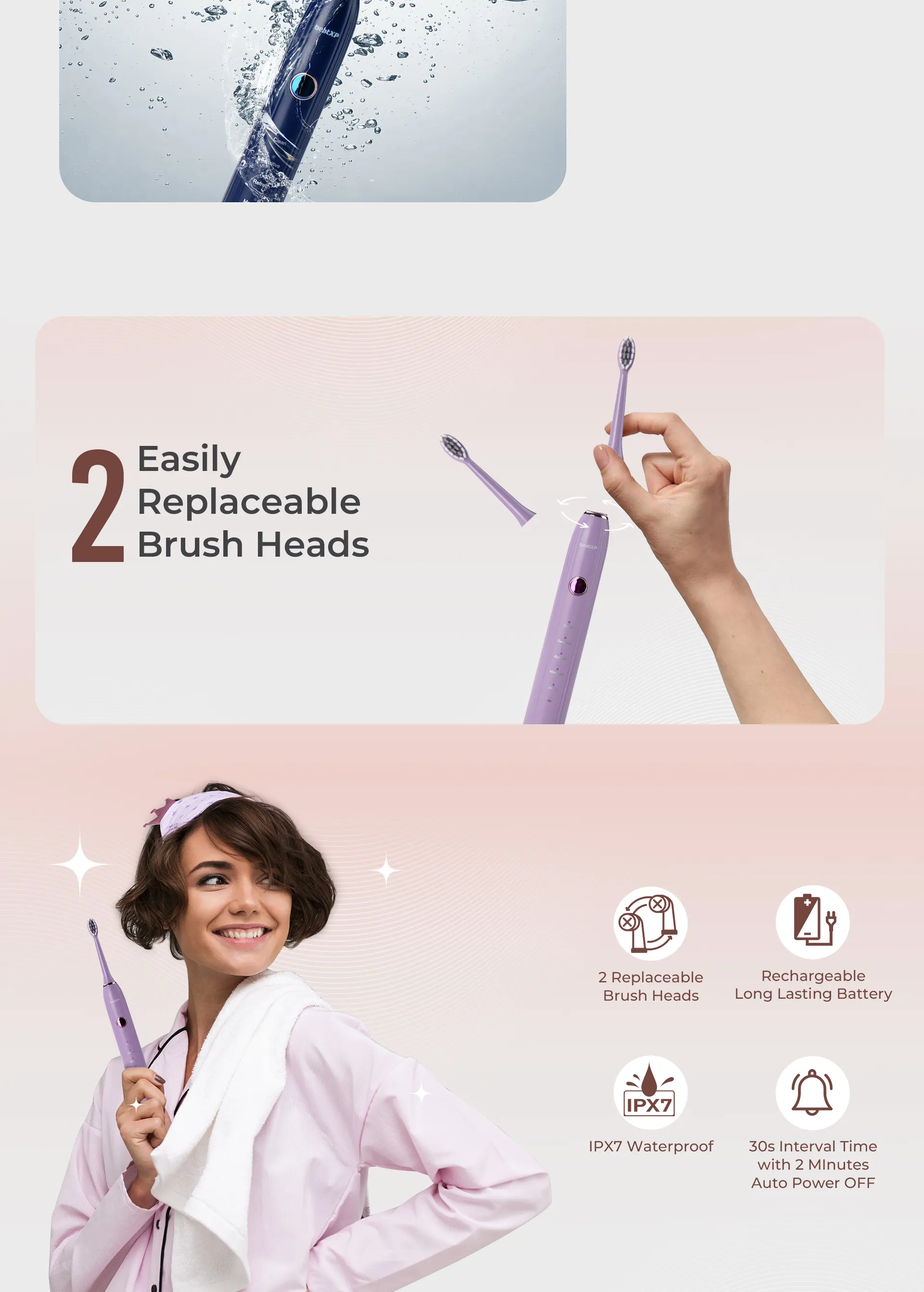 It also features five high-performing brush modes - Clean, Sensitive, Refresh, Massage, and White, making it the best electric toothbrush to personalize your brushing. The beatXP Mist Electric Toothbrush is IPX7-rated, which means it is waterproof and safe to use in the shower. It comes with 2 replaceable ultra-soft bristle brush heads, which suit teeth topography for thorough cleaning of gums and hard-to-reach areas, eliminating the need to order new ones frequently. With its innovation and effectiveness, the beatXP Mist stands out as an exceptional electric toothbrush device for promoting healthier teeth and gums. It ensures optimal daily oral care for you. Get your hands on it today and experience the difference!