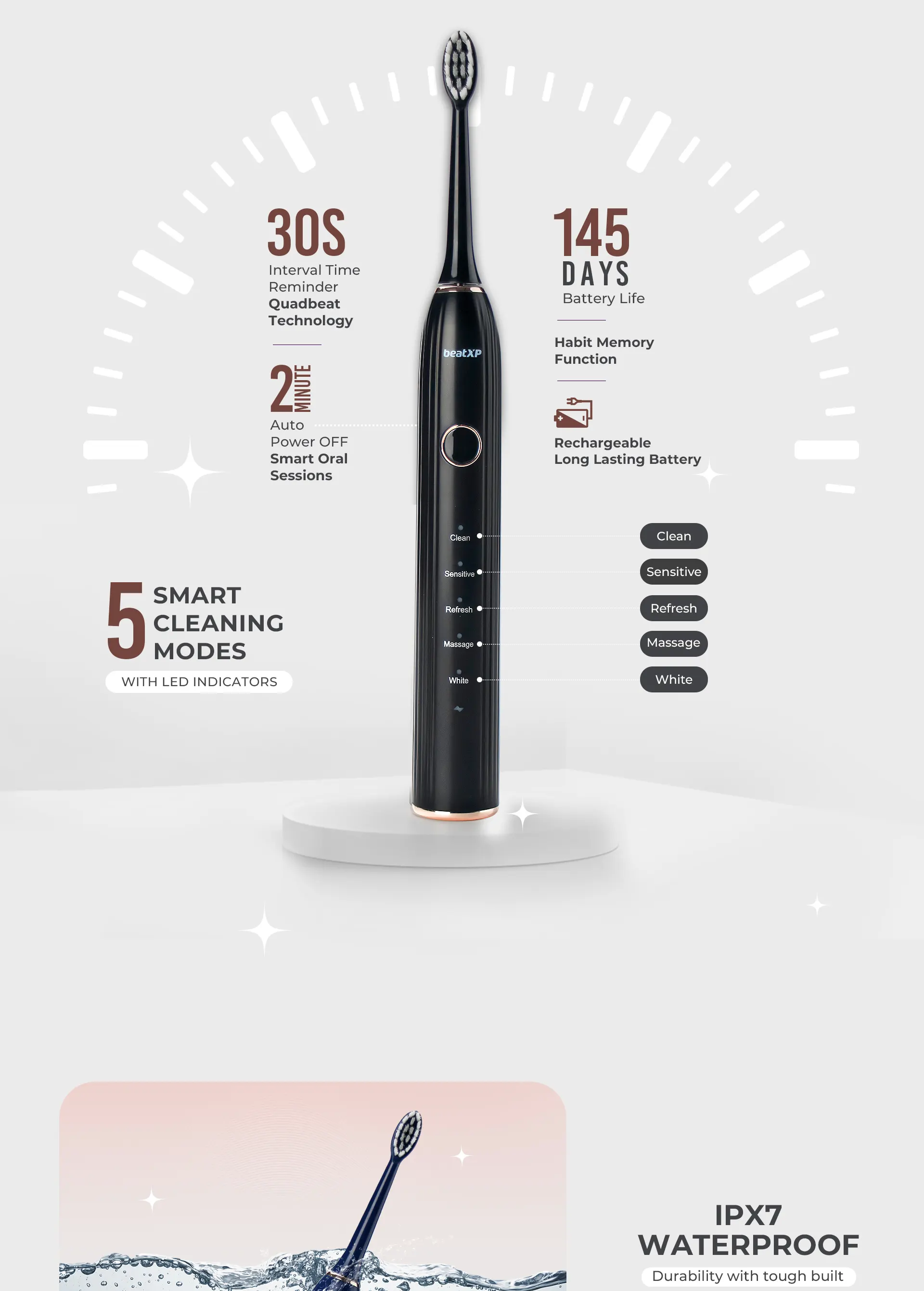 It also features five high-performing brush modes - Clean, Sensitive, Refresh, Massage, and White, making it the best electric toothbrush to personalize your brushing. The beatXP Mist Electric Toothbrush is IPX7-rated, which means it is waterproof and safe to use in the shower. It comes with 2 replaceable ultra-soft bristle brush heads, which suit teeth topography for thorough cleaning of gums and hard-to-reach areas, eliminating the need to order new ones frequently. With its innovation and effectiveness, the beatXP Mist stands out as an exceptional electric toothbrush device for promoting healthier teeth and gums. It ensures optimal daily oral care for you. Get your hands on it today and experience the difference!