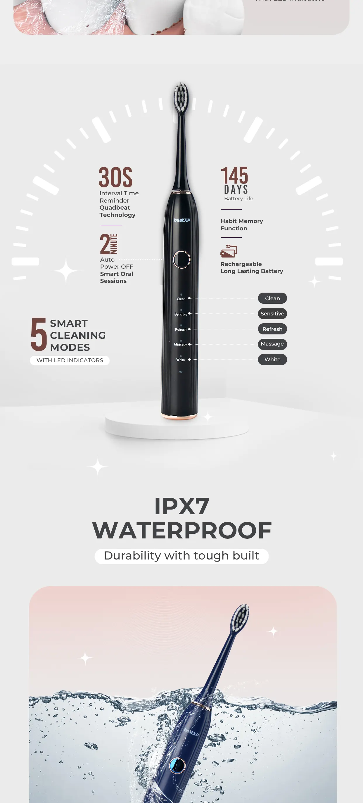 It also features five high-performing brush modes - Clean, Sensitive, Refresh, Massage, and White, making it the best electric toothbrush to personalize your brushing. The beatXP Mist Electric Toothbrush is IPX7-rated, which means it is waterproof and safe to use in the shower. It comes with 2 replaceable ultra-soft bristle brush heads, which suit teeth topography for thorough cleaning of gums and hard-to-reach areas, eliminating the need to order new ones frequently. With its innovation and effectiveness, the beatXP Mist stands out as an exceptional electric toothbrush device for promoting healthier teeth and gums. It ensures optimal daily oral care for you. Get your hands on it today and experience the difference!