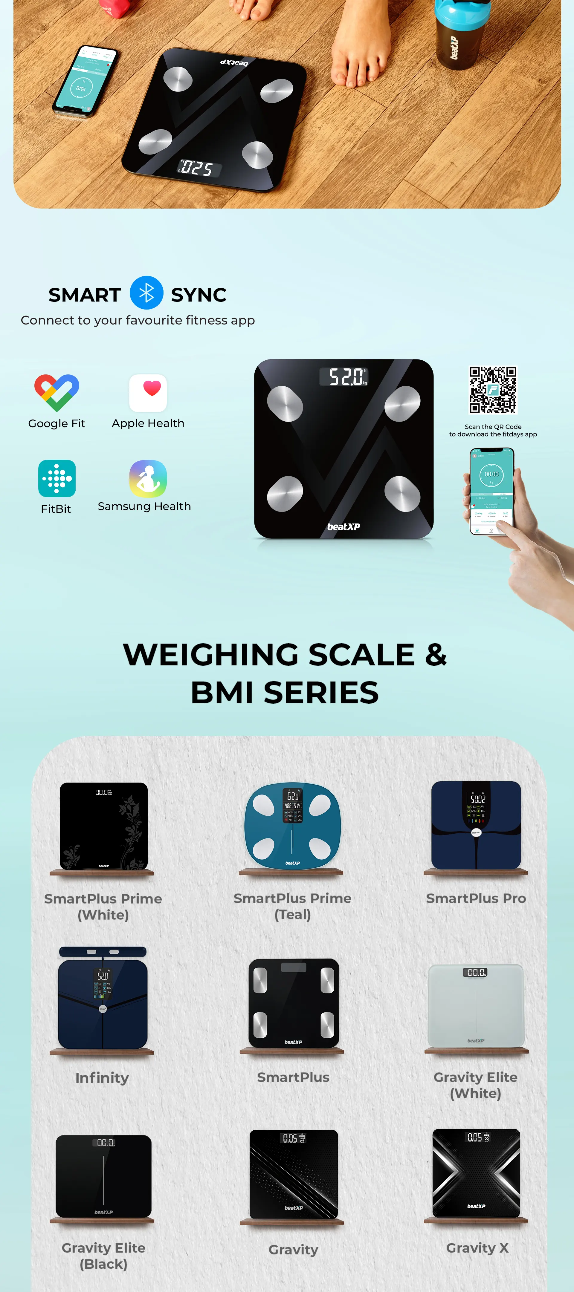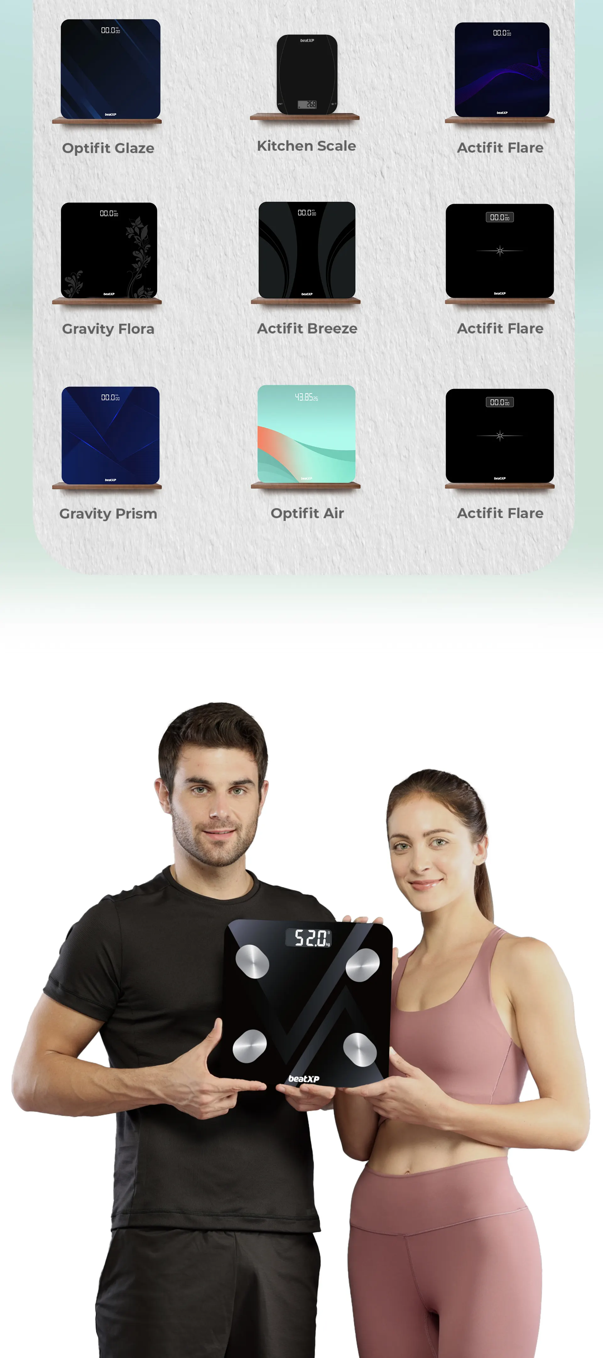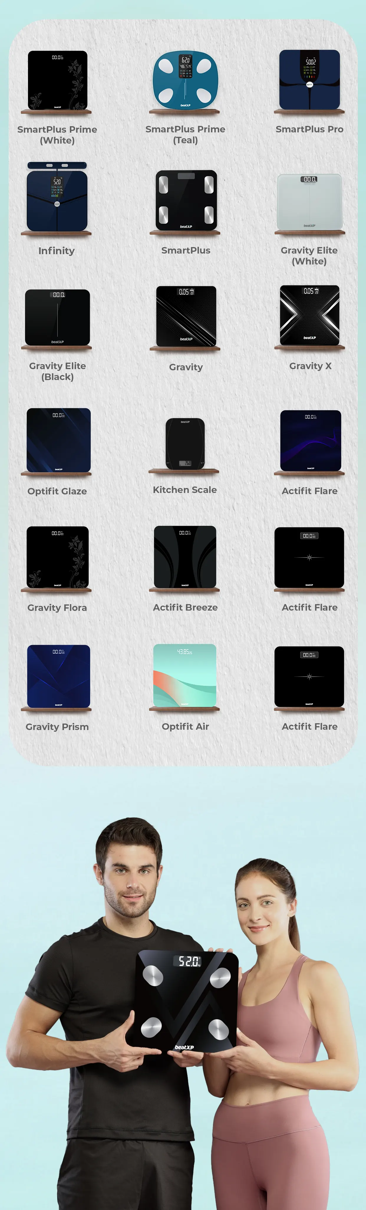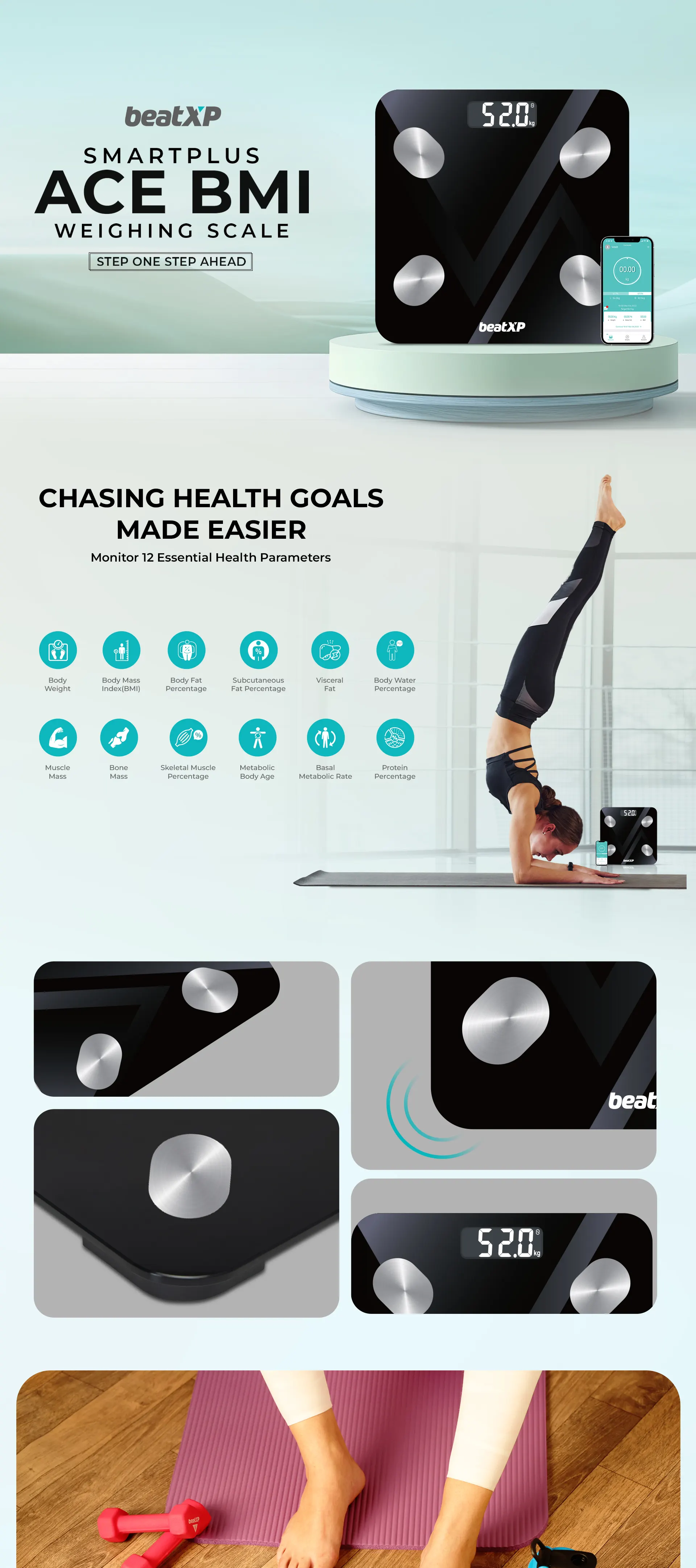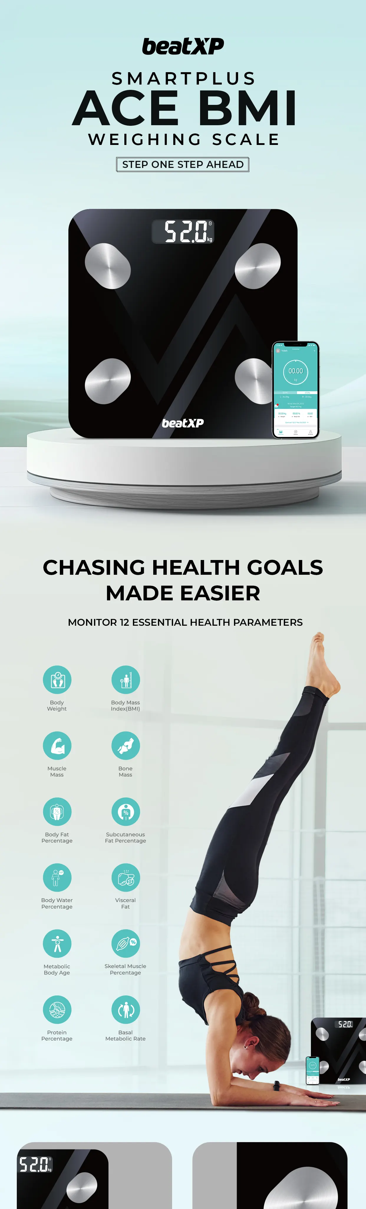 beatXP SmartPlus BMI Ace weight machine for body weight to keep you up to date with your health. This smart weighing machine measures a total of 13 body parameters — Body Weight, Body Mass Index (BMI), Body Fat Percentage, Fat-Free Body Weight, Subcutaneous Fat Percentage, Visceral Fat, Body Water Percentage, Skeletal Muscle Percentage, Muscle Mass, Bone Mass, Protein Percentage, Basal Metabolic Rate, Body Age.