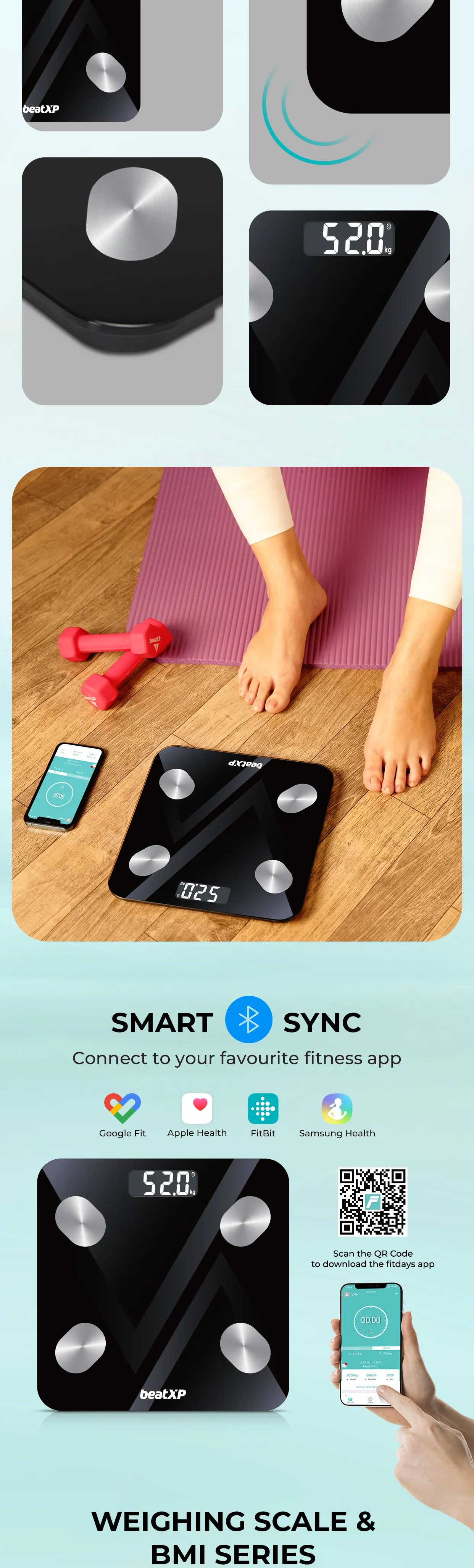 [EASY SYNC WITH APP] : Our Smart BMI weight scale automatically syncs with the Fitdays App (available on both android and iOS) via Bluetooth. It fetches your data in the app where you can monitor your vitals and health report. Scan the QR code from the manual to download the app.