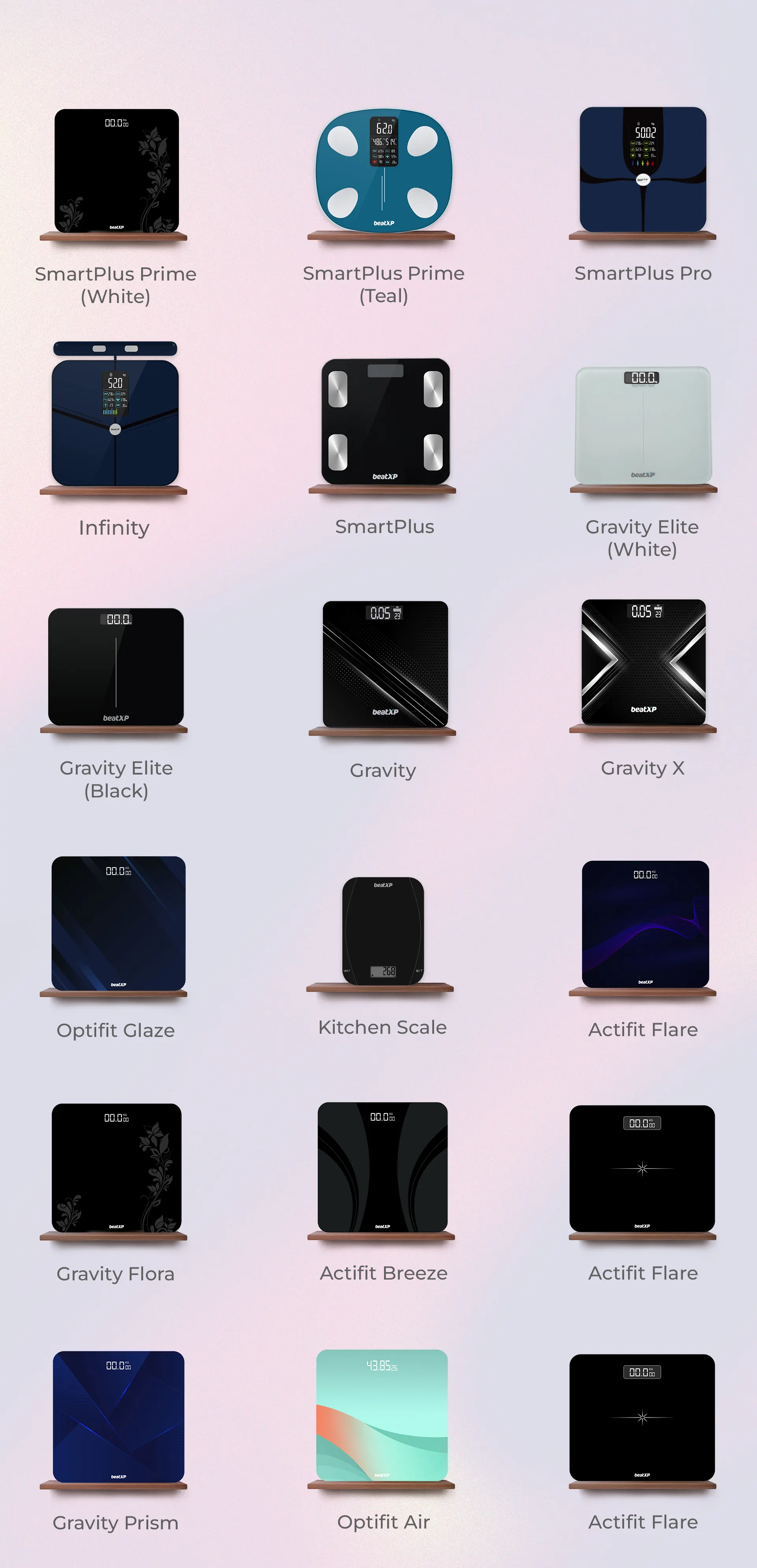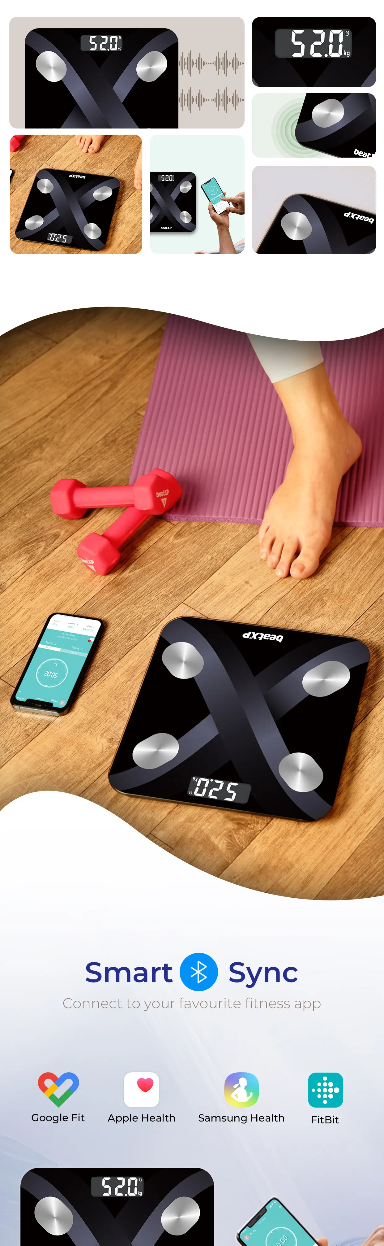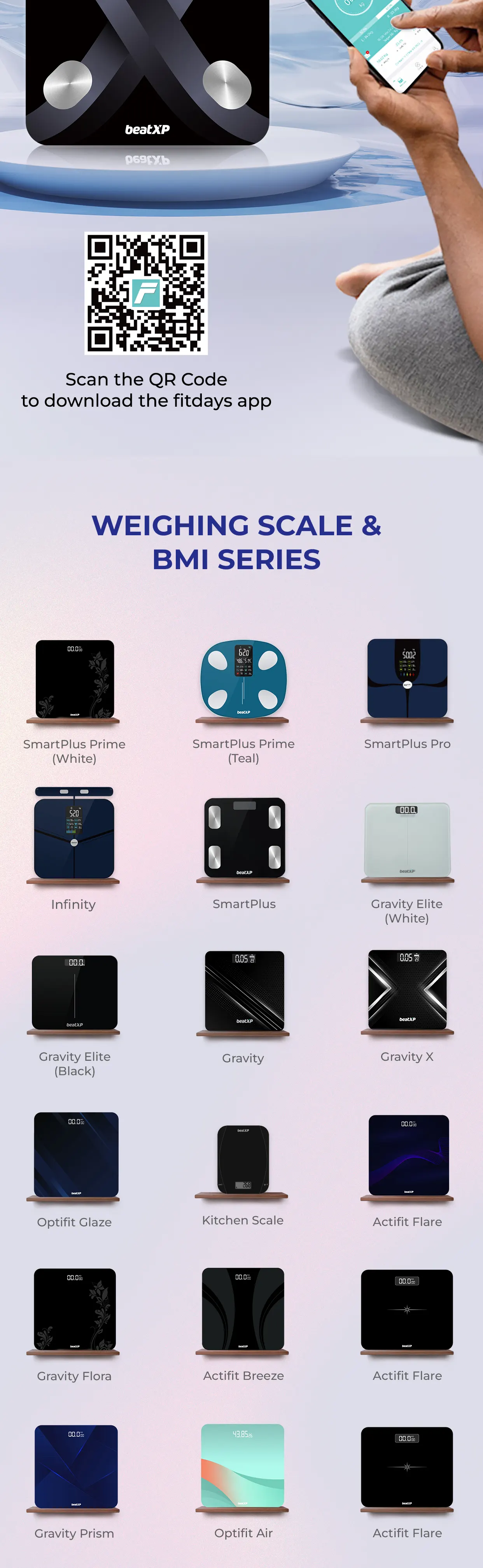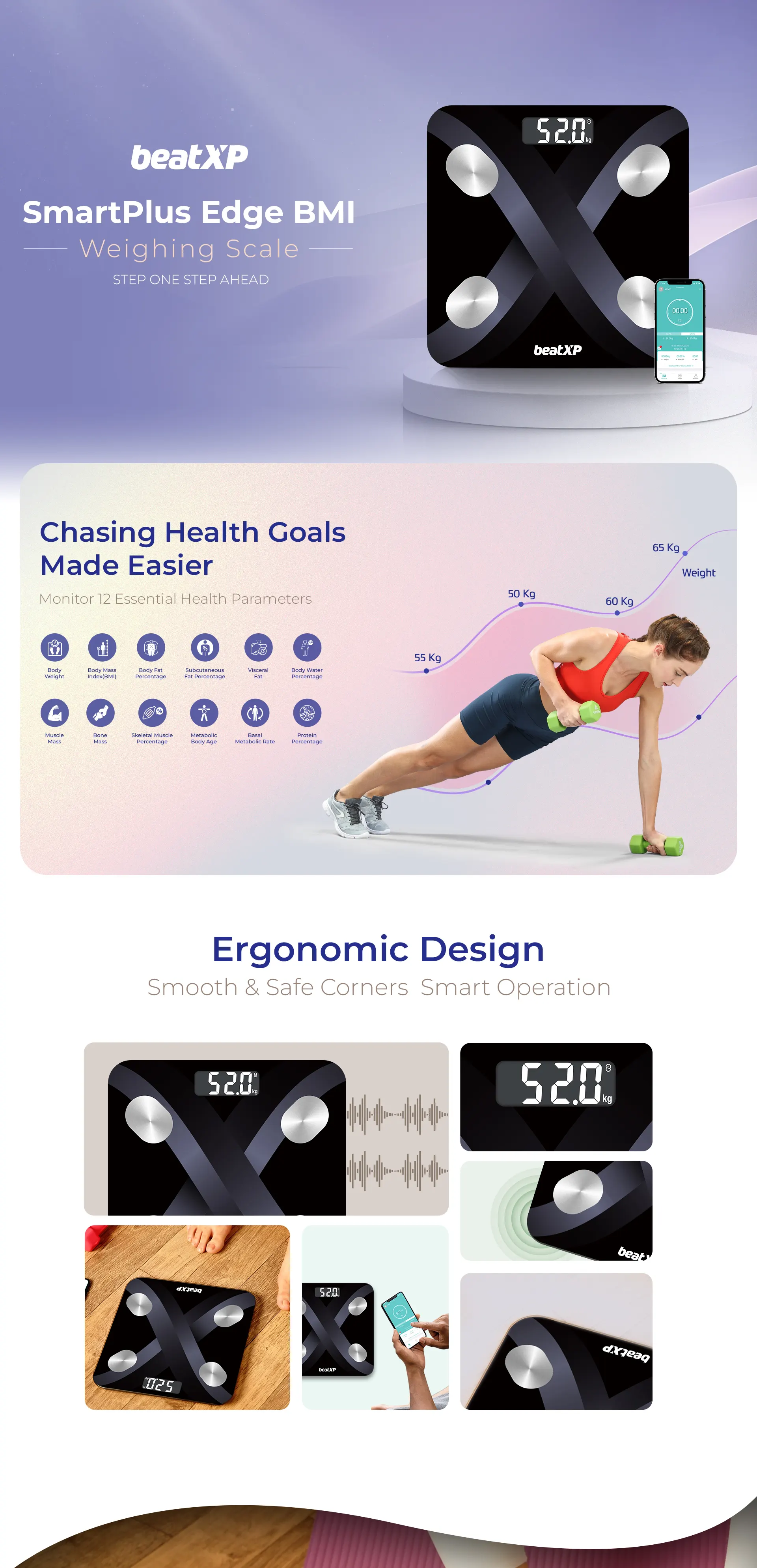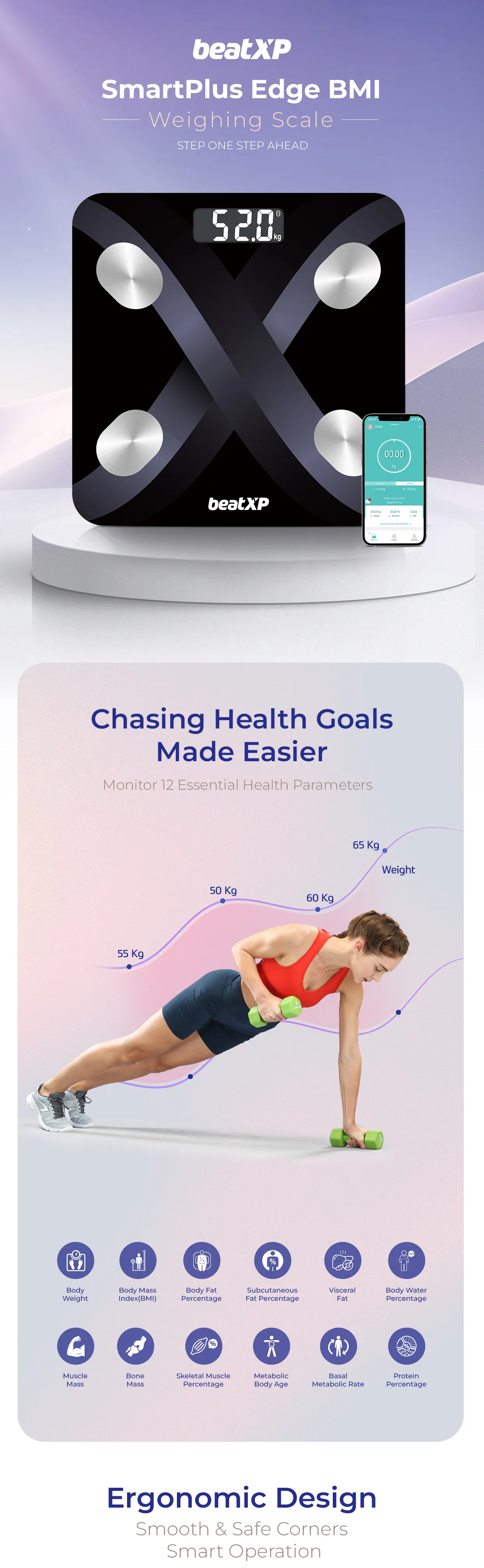 beatXP SmartPlus BMI Edge weight machine for body weight to keep you up to date with your health. This smart weighing machine measures a total of 13 body parameters — Body Weight, Body Mass Index (BMI), Body Fat Percentage, Fat-Free Body Weight, Subcutaneous Fat Percentage, Visceral Fat, Body Water Percentage, Skeletal Muscle Percentage, Muscle Mass, Bone Mass, Protein Percentage, Basal Metabolic Rate, Body Age.