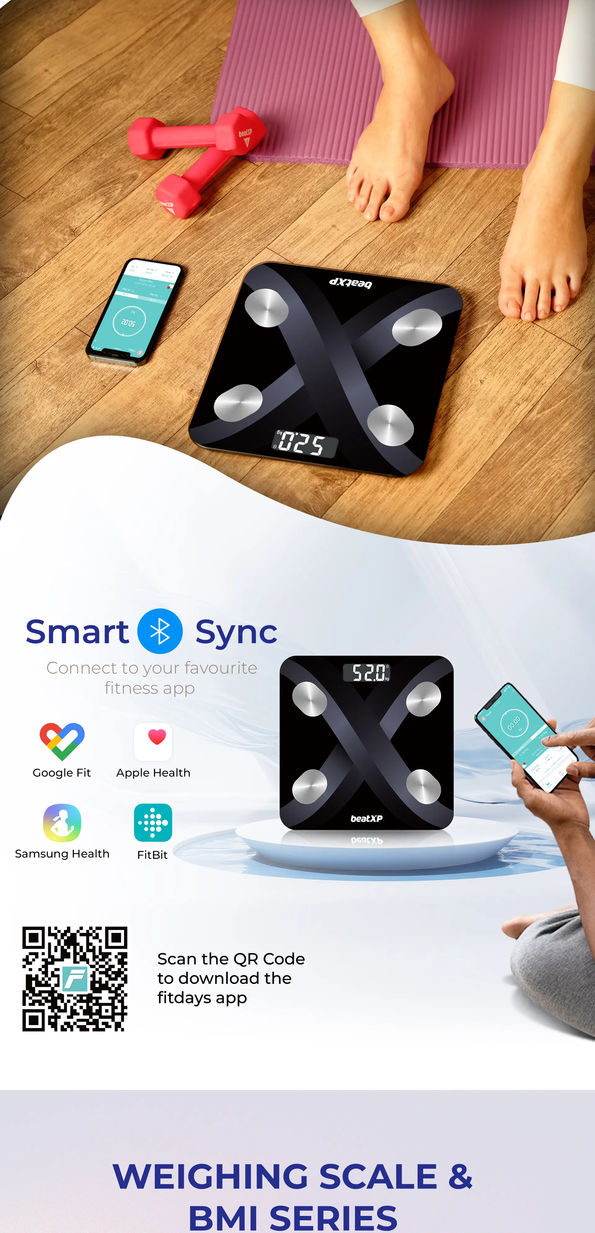 [EASY SYNC WITH APP] : Our Smart BMI weight scale automatically syncs with the Fitdays App (available on both android and iOS) via Bluetooth. It fetches your data in the app where you can monitor your vitals and health report. Scan the QR code from the manual to download the app.
