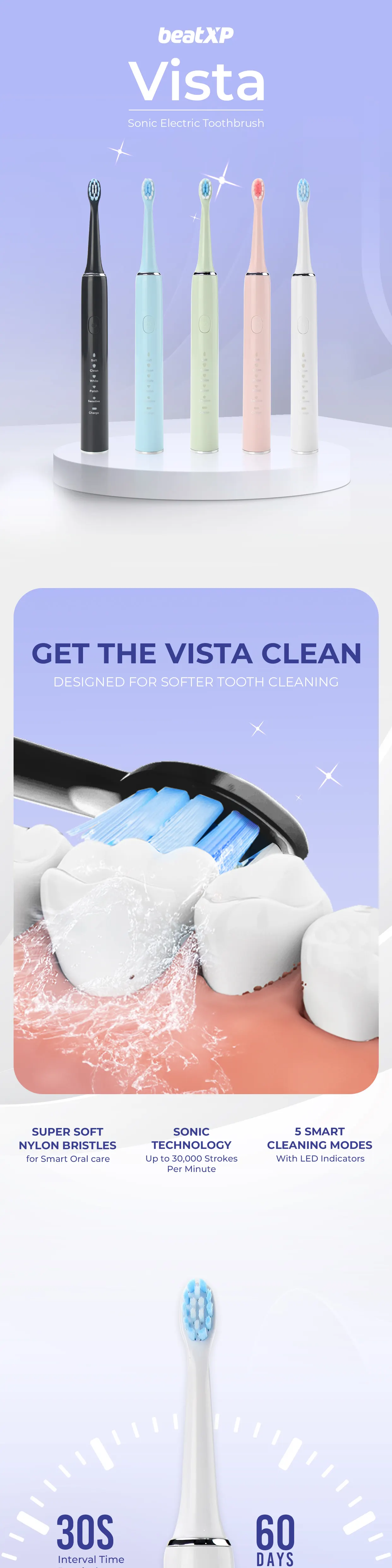 Smart Oral Care: beatXP Vista is a cutting-edge electric toothbrush that offers exceptional oral care by promoting healthier teeth and gums. Its advanced technology and high effectiveness ensure optimal daily oral hygiene.