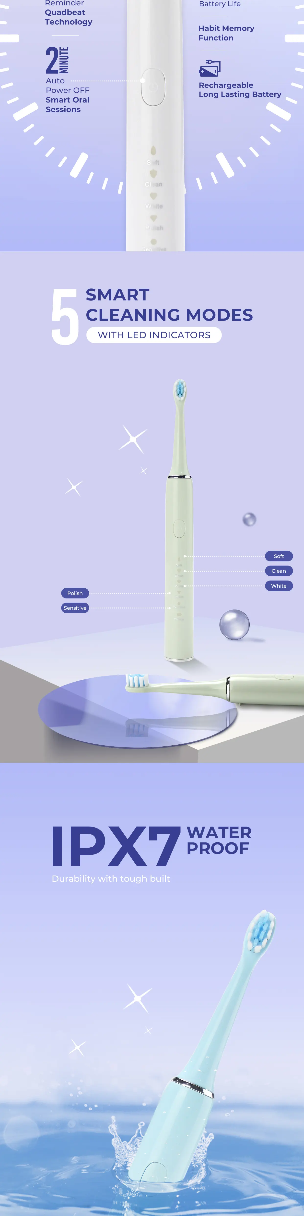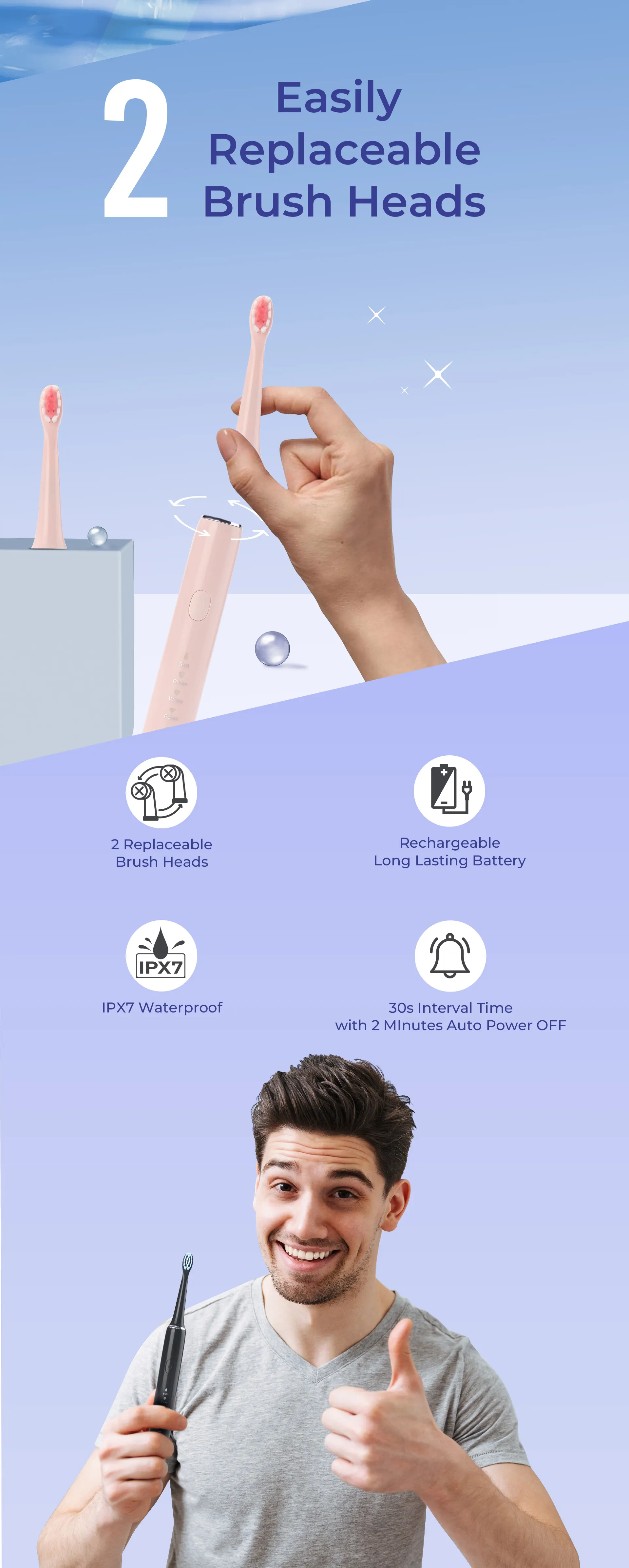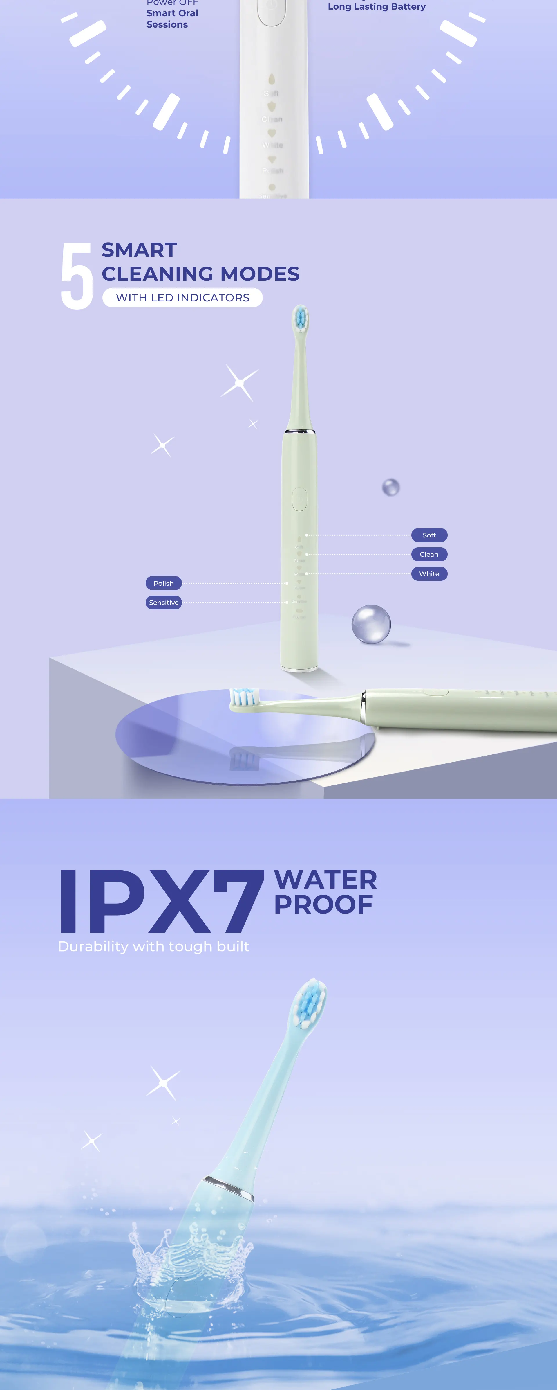 5 high-performance brush modes — Soft, Clean, White, Polish, and Sensitive, offer customized oral care based on individual needs. The toothbrush is IPX7 waterproof, allowing for safe and convenient use in the shower. The two replaceable ultra-soft bristle brush heads provide gentle and comprehensive cleaning, reaching hard-to-reach areas and reducing the need for frequent replacements.