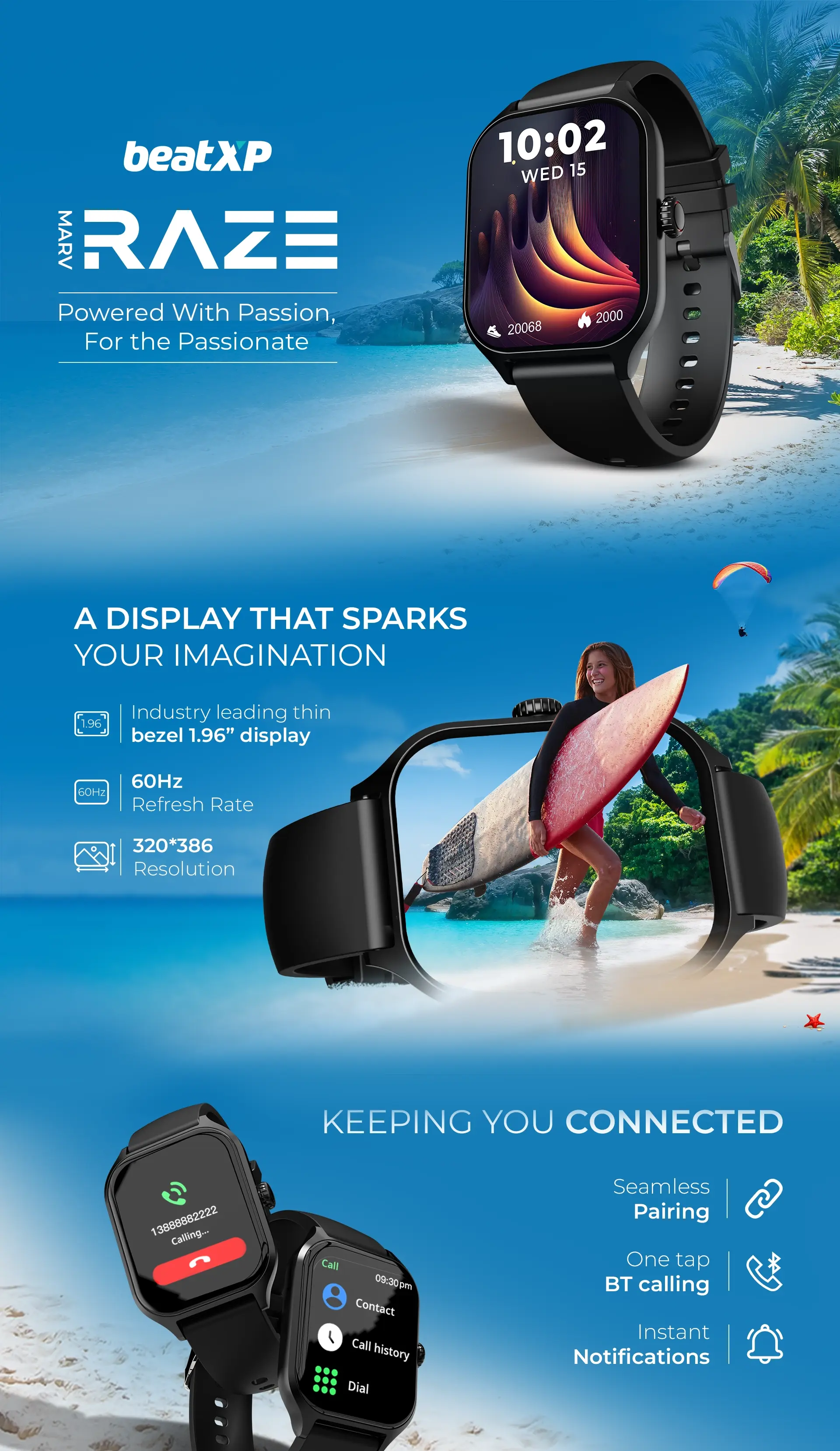 Experience the interactive elegant display with its super slim bezels. Get amazed by the swift refresh performance of the Marv Raze and feel the classy rotatory crown. Marv Raze encompasses a lot of surprises that you may not have experienced before. From seamless Bluetooth calling to real-time health tracking, Marv Raze has it all. Redefine your passion for elegance and fashion with Marv Raze.
