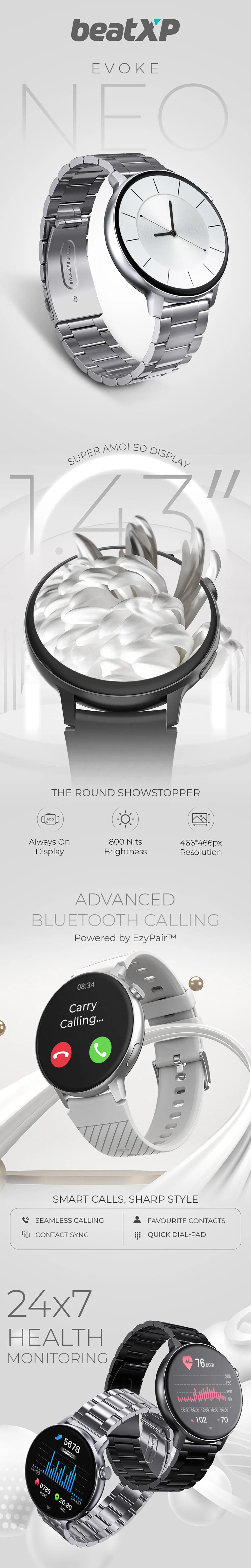 Experience the epitome of smart watch technology with the beatXP Evoke Neo. Boasting an impressive 1.43" Super AMOLED Display with an Always On Display feature, this watch offers a 60Hz refresh rate and a peak brightness of 800 Nits. Not only is it stylish, but it also includes advanced Bluetooth calling with EzyPair™ Technology for seamless communication without a phone.