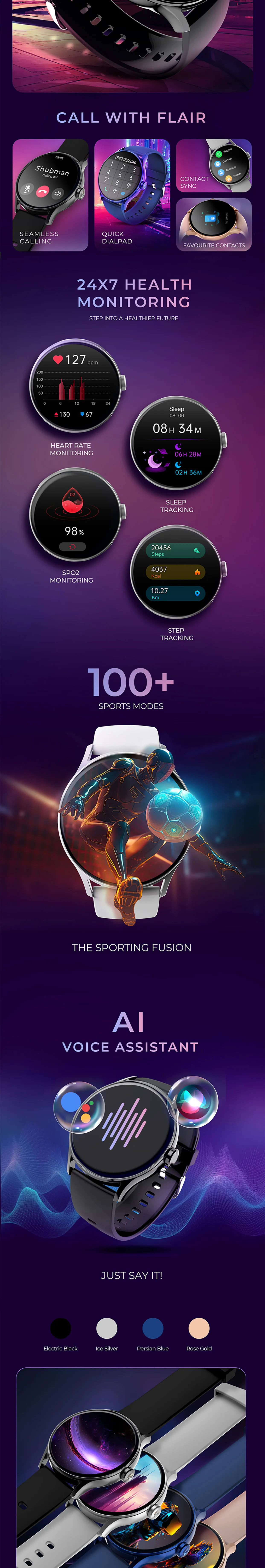 Make and receive calls directly from your wrist with Flare Pro's advanced one tap Bluetooth Calling feature, powered by EzyPair™ Technology. Keep track of your wellness with 24/7 health monitoring for heart rate, sleep patterns, SpO2, and more. Plus, it's water-resistant up to IP68, ideal for spontaneous adventures and quick swims.