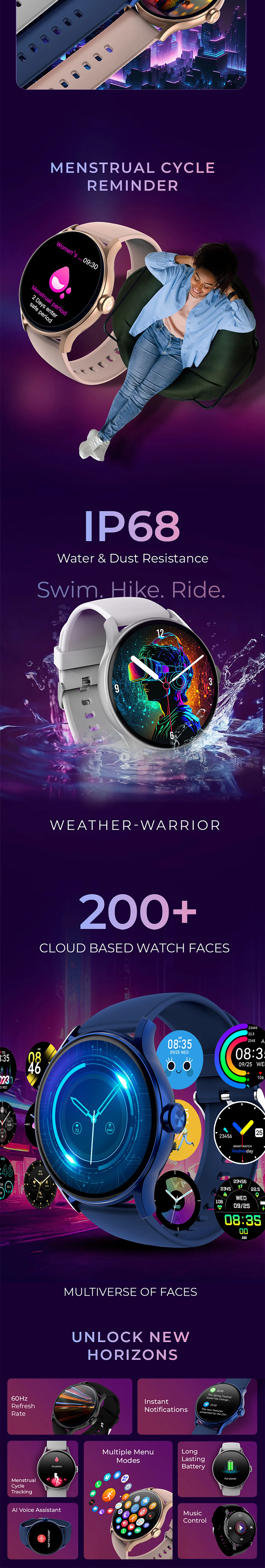 Our fitness and sports smart watch has over 100 sports modes, including yoga, swimming, and high-intensity training. It's the ultimate fitness tool for unleashing your inner athlete. Women will love the menstrual cycle reminders, exclusively designed for them.
