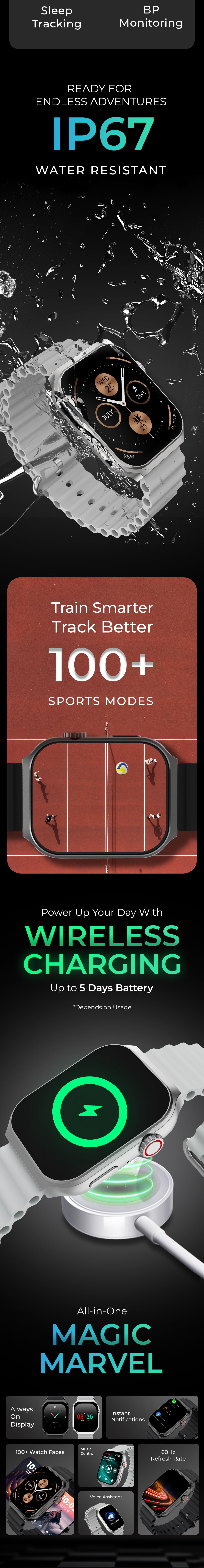 With over 100 sports modes, tracking your fitness activities is also effortless. Not only is Marv Ultra functional, but it's also sleek and compact, ensuring comfortable wear. And with its long-lasting battery life, you can rely on it to keep you powered throughout the day.