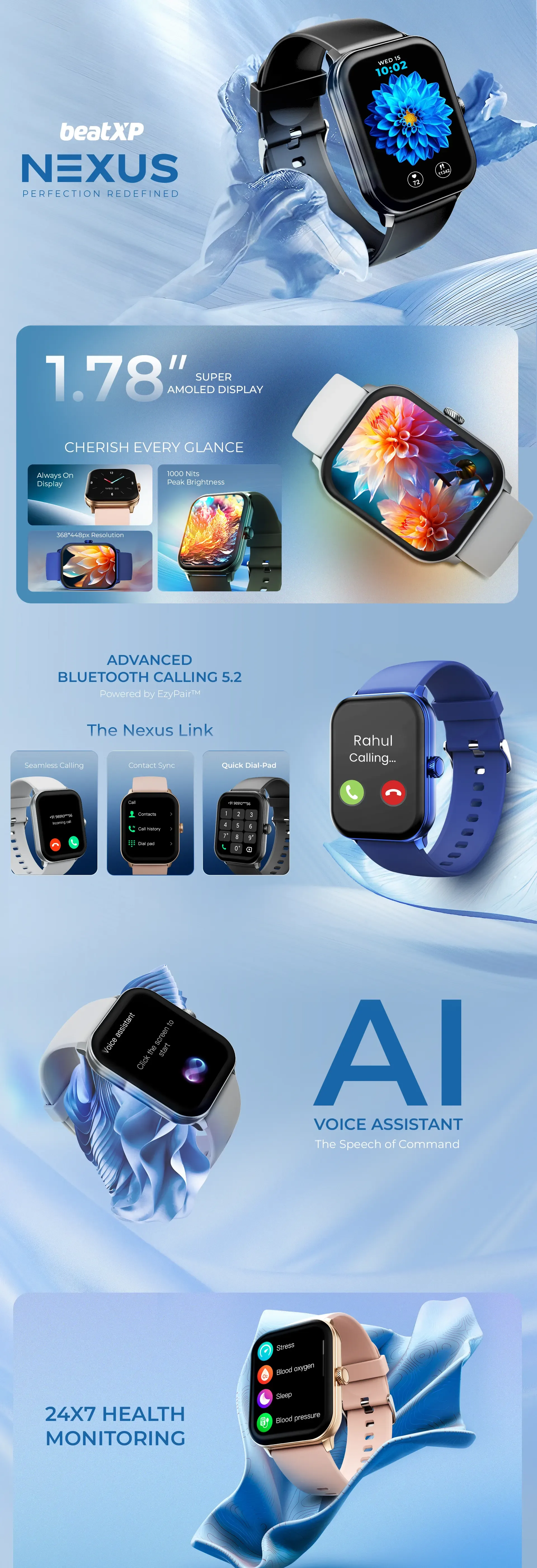 The beatXP Nexus smart watch for men is the perfect blend of style and functionality designed for outdoor enthusiasts and athletes who are always on the go. The expansive 1.78" Super AMOLED screen with an Always On Display offers unmatched comfort, while the advanced metallic design elevates your style effortlessly.