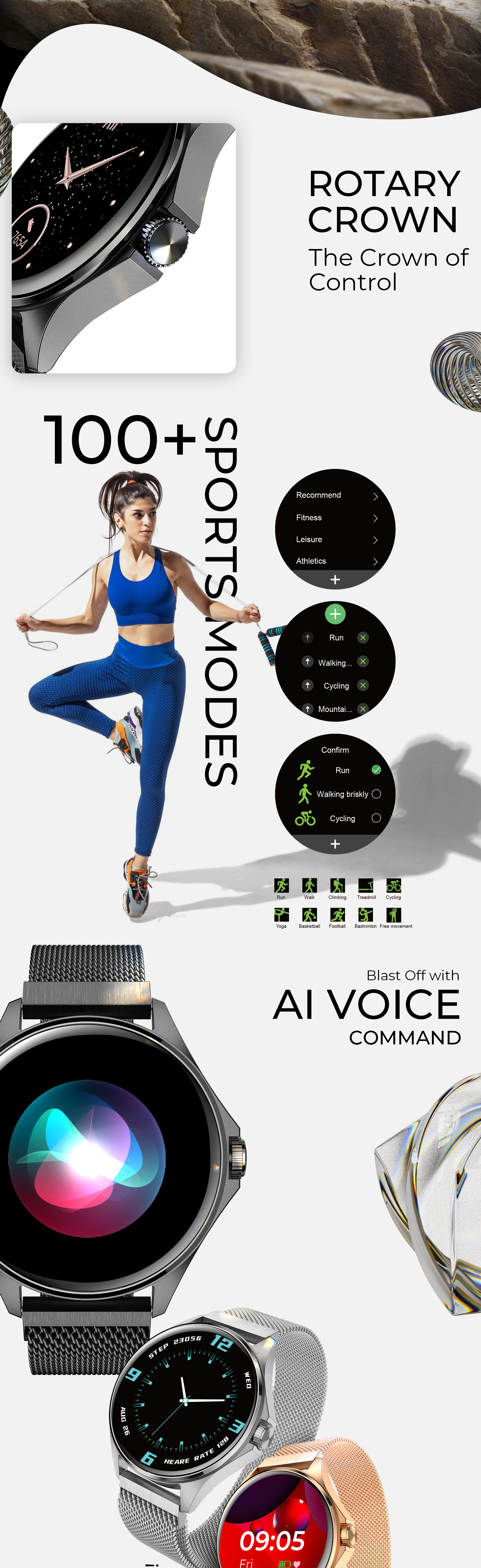 Stay organized with our AI voice assistant and never worry about battery life as Nuke is fast wirelss charging and long-lasting battery smartwatch. Express yourself with our selection of 200+ cloud-based watch faces and take control of your music experience with our music control feature.