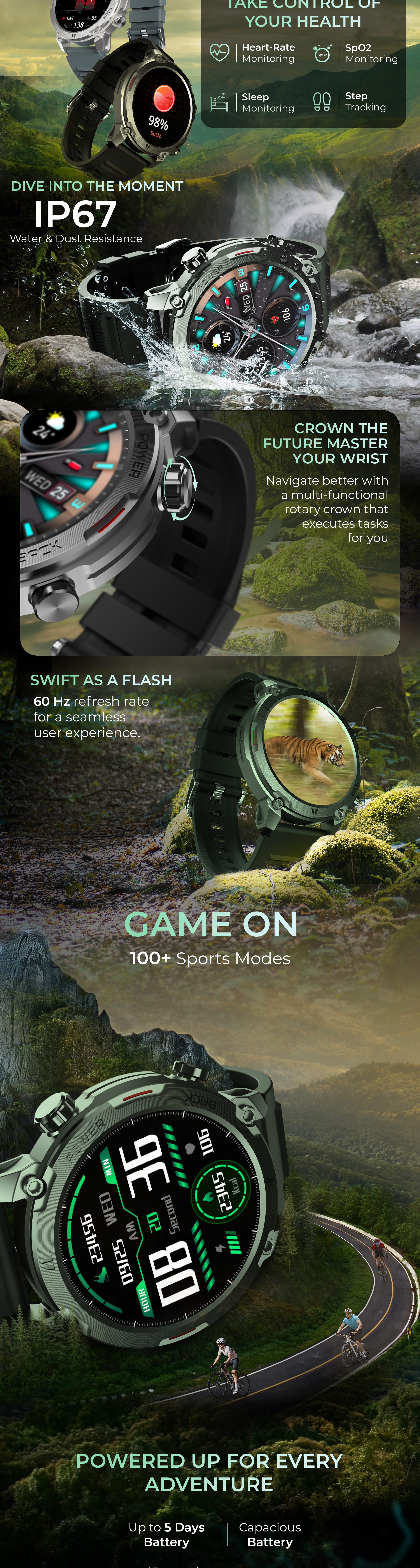 Additionally, Terra is equipped with a long battery 300 mAh that makes it the best battery life smart watch, and an advanced health suite that tracks your core vitals like heart rate, spo2, sleep.
