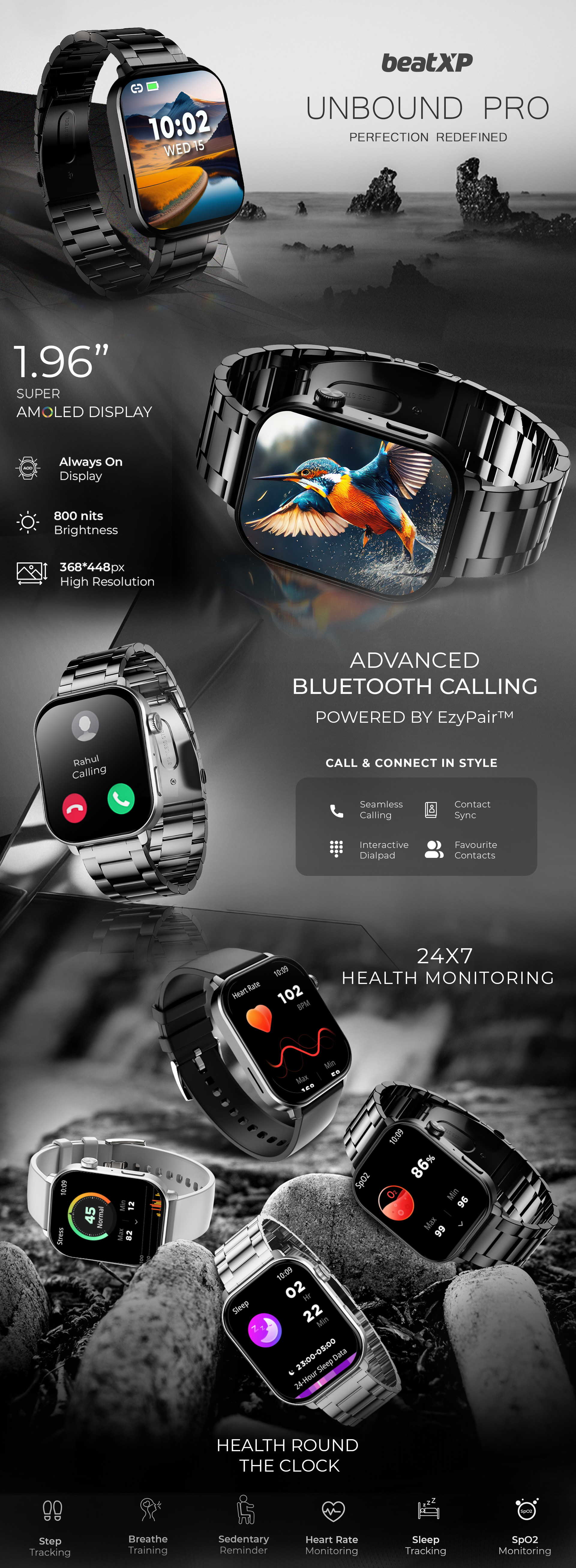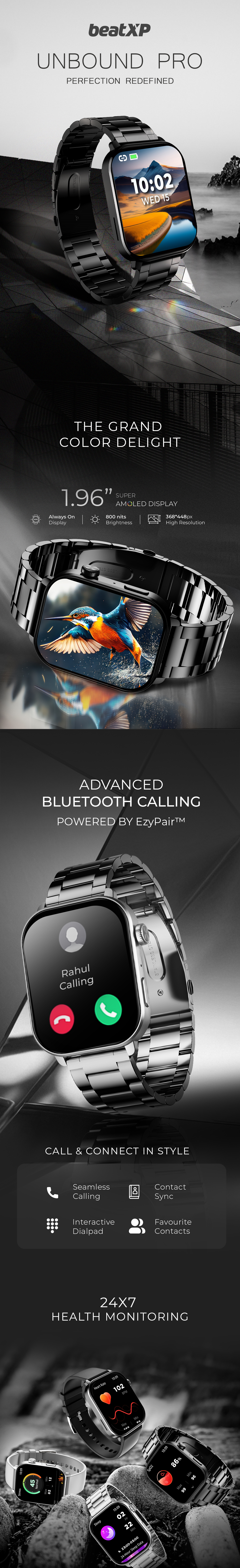 The beatXP Unbound Pro smartwatch is the perfect blend of style and functionality, designed for outdoor enthusiasts and athletes who want to stay connected while on the go. The smart watch features a large 1.96" Super AMOLED screen with an Always On Display that provides unparalleled comfort and convenience. The advanced metallic design is a statement piece, perfect for those who want to effortlessly elevate their style.