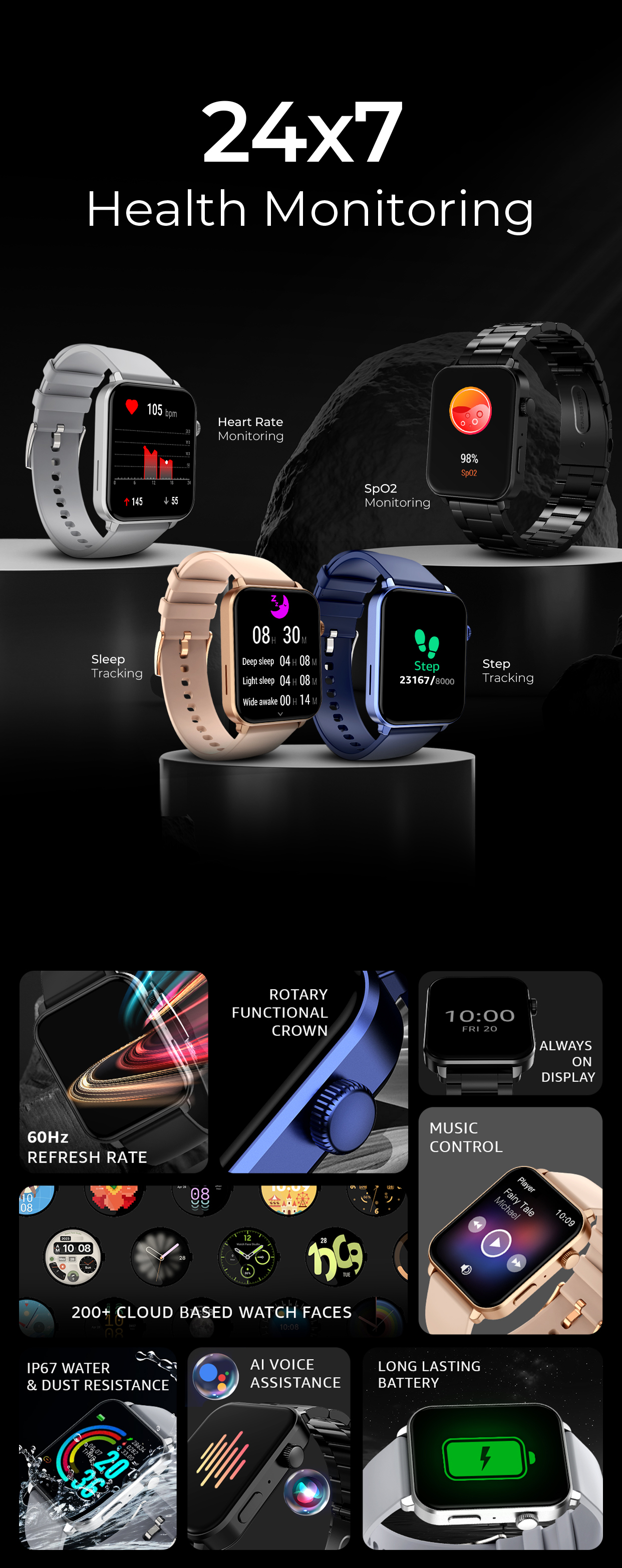 Our comprehensive 24/7 tracking system ensures constant monitoring of vital indicators such as heart rate, sleep patterns, SpO2 levels, and menstrual cycle reminders. The watch caters to outdoor enthusiasts with its IP67 water-resistant feature and over 100 sports modes to choose from, making it the best sports and fitness smartwatch.