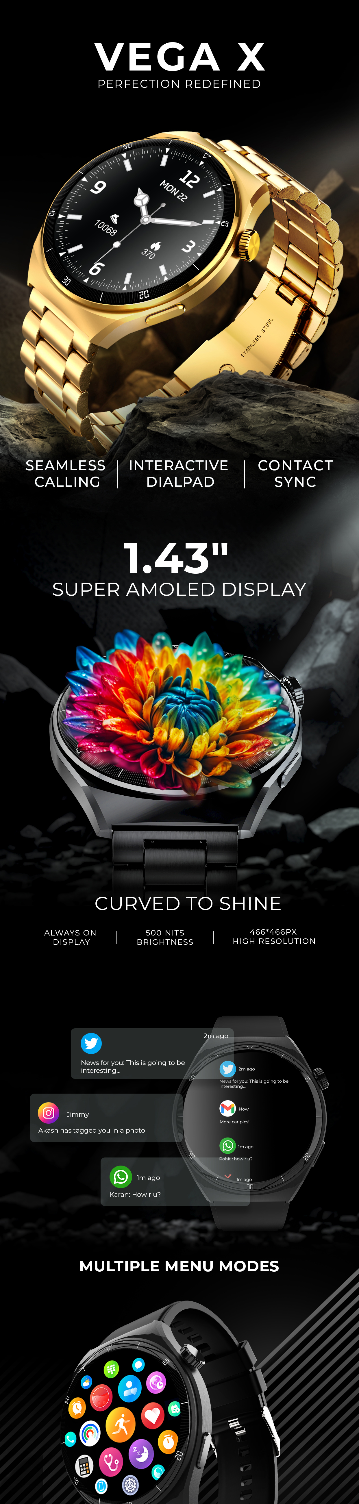 You can swim or run in the rain as Vega X is an IP68 smartwatch with water resistance. The traditional, classic design makes Vega X an ideal round dial smartwatch- all set to help you ace every day!